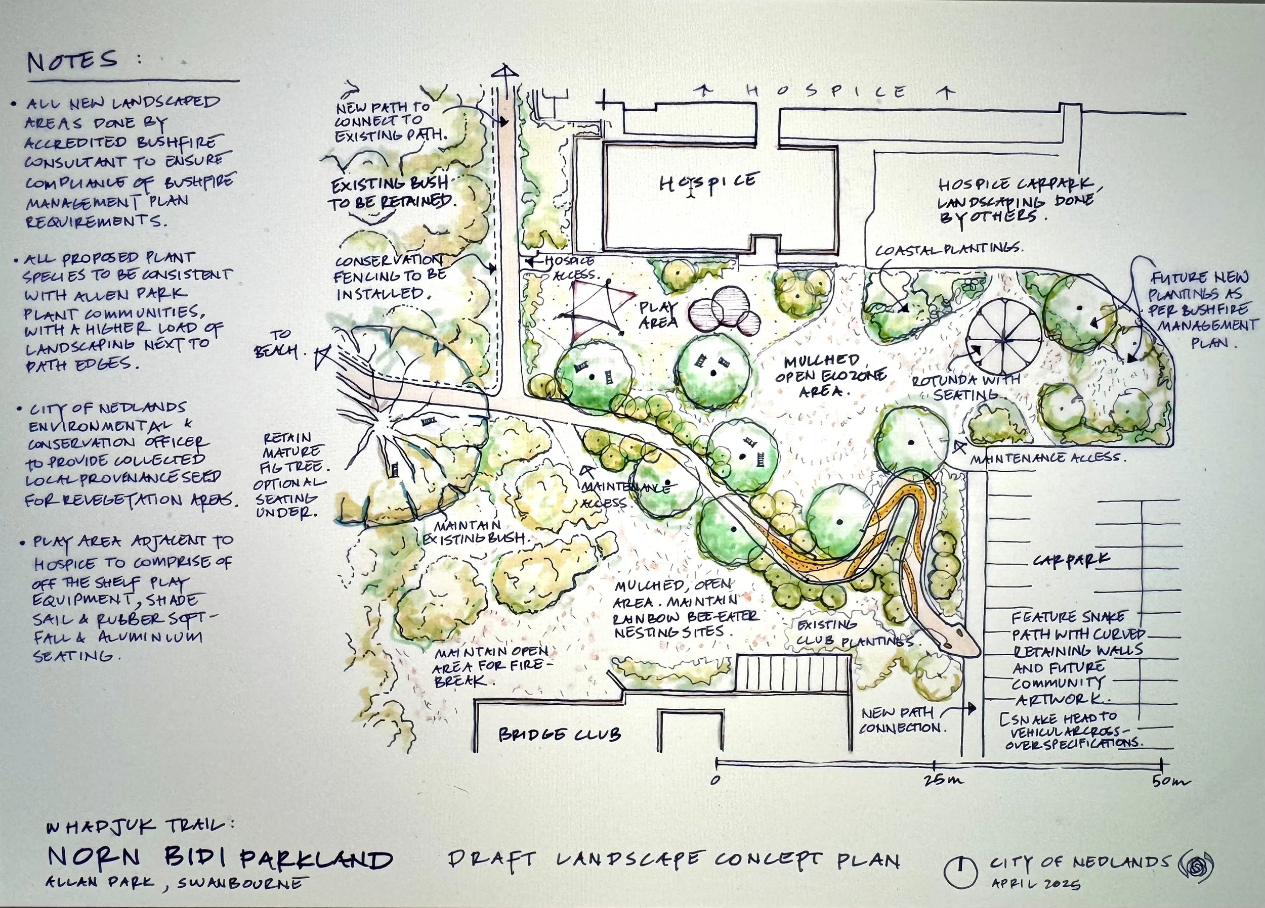 The Norn Bidi Parkland Project commenced in 2022 when the City of Nedlands voted to complete the final section of the nationally recognised Whadjuk Bush to Beach Trail, which runs from Kings Park to the coast, by building an all-abilities pathway across a well used section of Allen Park.