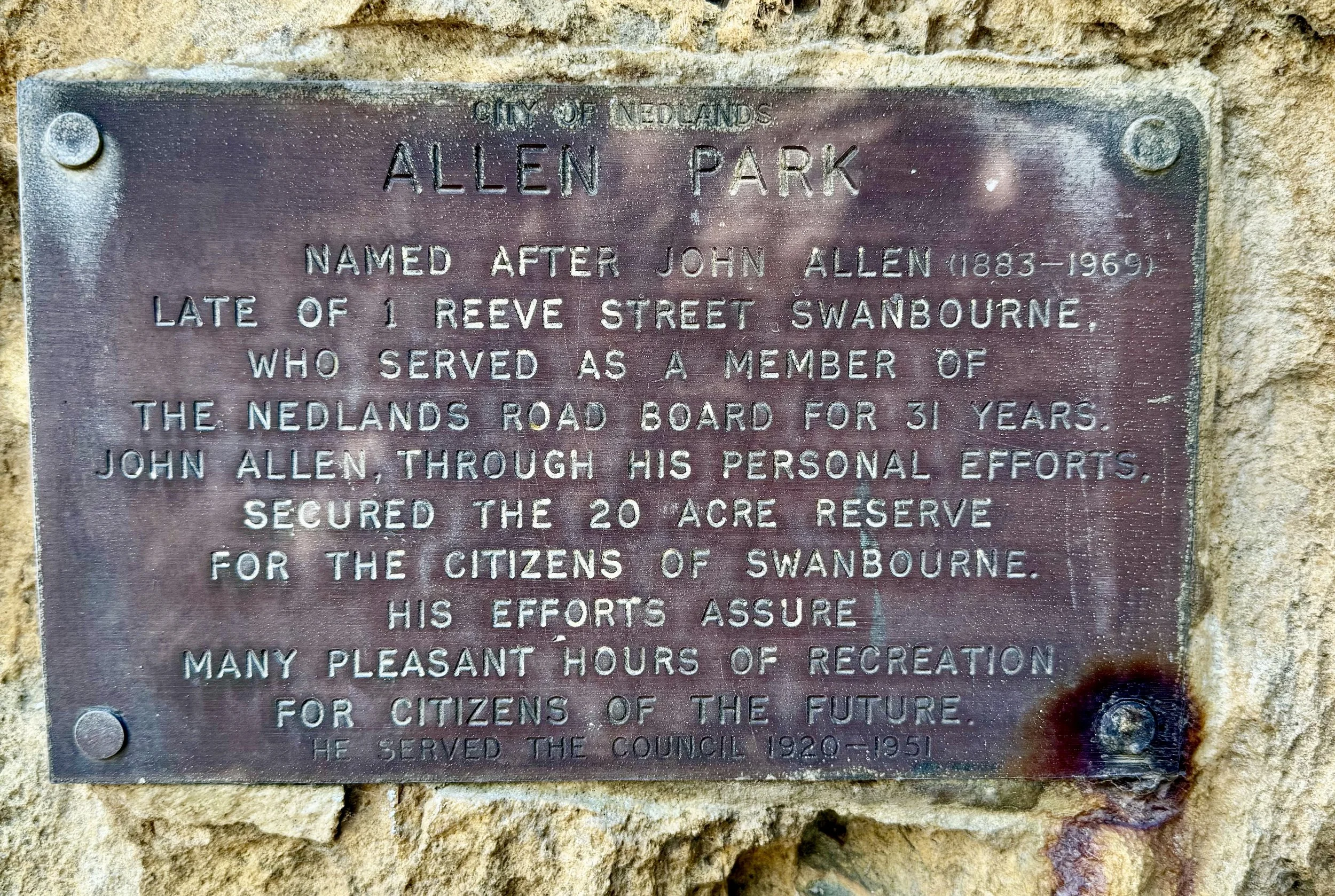 In recognition of the extraordinary work of Councillor John Allen, Throssell Park Reserve was re-named ‘Allen Park’ in 1931.